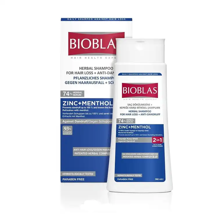 Description : Anti-Dandruff, specially formulated to combat dandruff and refresh your scalp. The unique blend of menthol, Zinc Pyrithione, and Vitamin B3 works synergistically to effectively fight and eliminate dandruff, while simultaneously strengthening the protective layer of the scalp, reducing itching sensations.In an extensive consumer test, an impressive 93% of participants reported that Bioblas played a crucial role in preventing hair loss. Dermatologically tested to ensure compatibility with the scalp’s pH, our shampoo provides a gentle and nourishing cleansing experience. The patented herbal complex B19, meticulously developed by Bioblas, has undergone clinical testing, proving its efficacy in preventing hair loss and promoting overall hair health . Choose Bioblas Zinc + Menthol 360ml for a scientifically-backed solution that not only addresses dandruff concerns but also actively contributes to the well-being and resilience of your hair. Trust in our commitment to quality and innovation in hair care . Best Anti-Dandruff and Anti-Hair Loss Bioblas Shampoos Uniqueness : Therapeutic: This cleansing shampoo is a remedy for an itchy scalp and dandruff, packed with vitamins and serums to soothe the scalp, reduce hair loss, and add strength and volume to the hair . Dual-action: Offering both shampoo and conditioner benefits in one, our shampoo conditioner promotes nutrient absorption and increased blood circulation, all while removing the flaking scalp . Hair growth: Specifically designed to support those suffering from hair loss, this hair growth shampoo minimizes hair thinning and repairs damage, leaving hair healthy, shiny, and voluminous . Bioblas anti dandruff shampoo: With a unique formula containing Zinc Pyriton & Vitamin B6, the effective dandruff shampoo fights dandruff effectively, strengthening the protective layer of the scalp, and providing relief with Menthol . Universal: Suitable for men and women of all hair types, from curly to oily, this fragran
