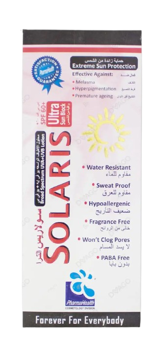 Solaris Ultra Sunblock lotion having the SPF 60+ is a gentle oil-free formula that physically blocks the damaging rays of the Sun to provide instant protection. Solaris Ultra provides broad-spectrum UVA/ UVB protection with naturally sourced ingredients. Gentle enough for all types of skin. It is waterproof, sweat proof, Hypoallergenic, fragrance-free, and PABA-free .